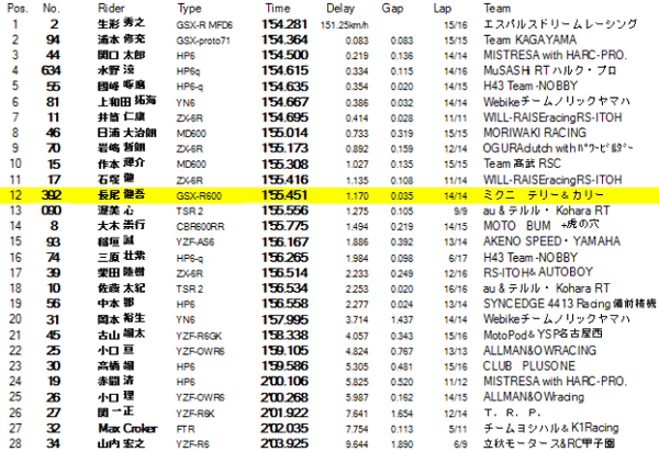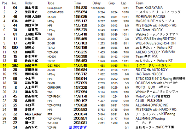 内容:在35分钟较短的预赛时间里,预赛中最小限度应对变化,中途修理,无换胎,瞄准时间自力的完成。这样的气势的结果,最后第14圈最好的记录时12名。昨天作为目标的55秒也终于如愿以偿,接下来就是通过比赛看到了新的课题。